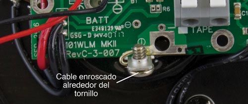 - Para conectar la placa de circuitos, afloje los dos tornillos del Sonalert. Enrosque los dos cables pelados de la placa de circuitos alrededor de los tornillos, entre la cabeza del tornillo y los terminales del Sonalert. Comience llevando los cables debajo de los tornillos (vea la fotografía de abajo). Apriete los dos tornillos.