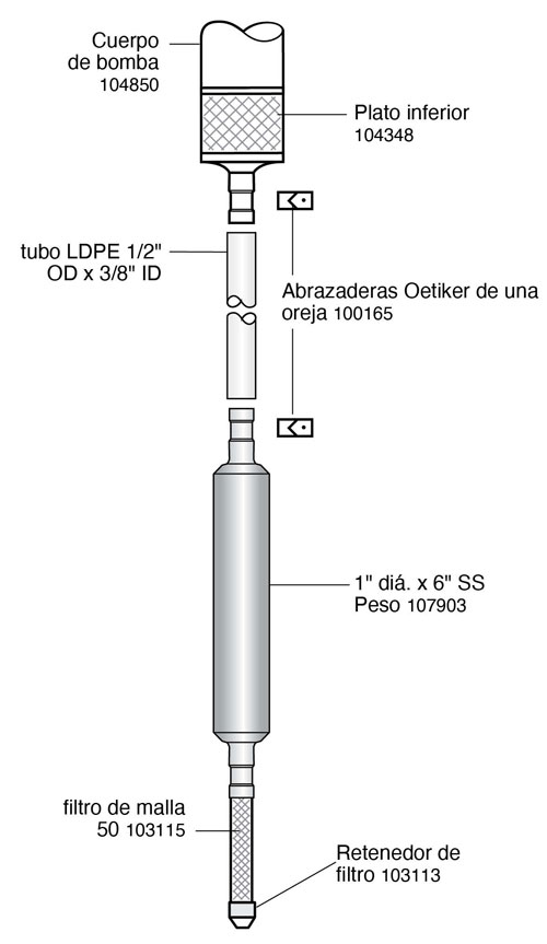 - Un extremo de la pesa de acero inoxidable de 1" de diámetro x 6" está roscado (NPTF) para recibir el conjunto del filtro. El extremo opuesto del Peso no está roscado, y se ajustará con el tubería de 1/2" de diámetro exterior x 3/8" de diámetro interior y sujeta con una Abrazadera Oetiker.