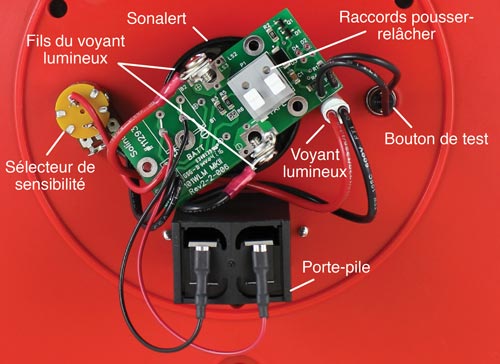 - Retirez l'ensemble de la carte de circuits imprimés, ainsi que les fils de branchement, le bouton de test, le sélecteur de sensibilité et un voyant lumineux ancien modèle (voir la photo ci-dessus).