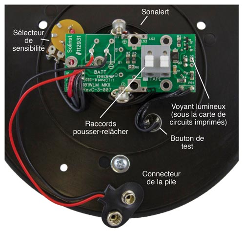 - Retirez l'ensemble de la carte de circuits imprimés, ainsi que les fils de branchement, le bouton de test, le sélecteur de sensibilité et un voyant lumineux ancien modèle, si raccordé (voir la photo ci-dessus).