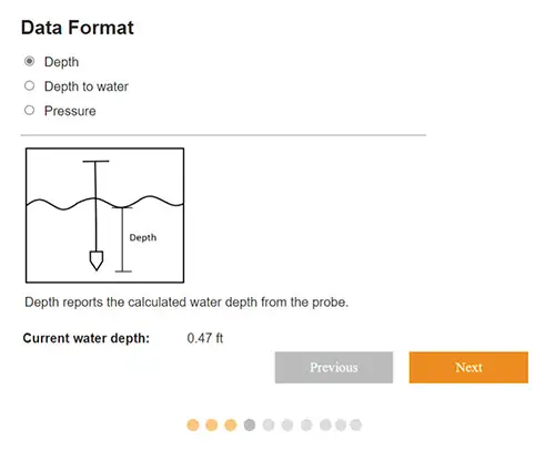 - Sélectionnez ensuite le format de données souhaité pour les données déclarées : Profondeur : indique la profondeur de l'eau calculée à partir de l'enregistreur de données Solinst.