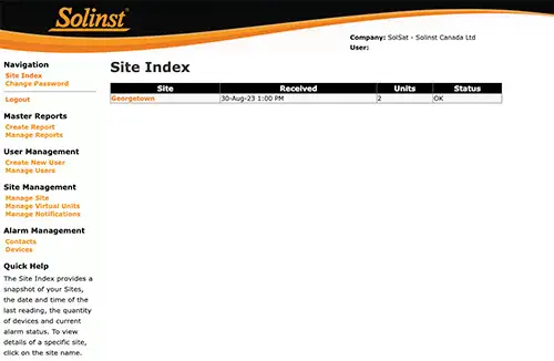 solinstsat.com vous permet également de créer des rapports, de gérer des comptes utilisateurs, des sites de projet, des appareils et des alarmes.
