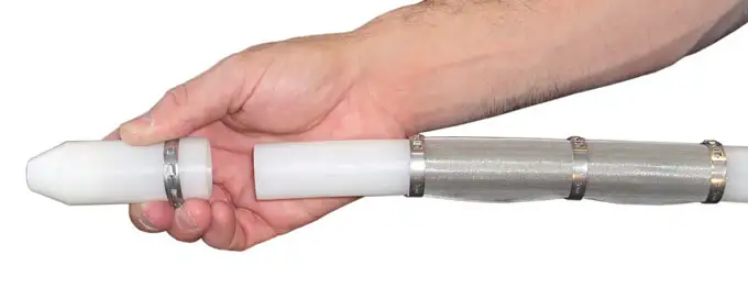 Slide the Guide Point over the end of the CMT tubing and secure it to the tubing with one stainless steel clamp (Figure 19). The guide point is a solid piece without any port opening. The end of the Guide Point Assembly is tapered to prevent the bottom of the CMT tubing from getting snagged on a rock ledge or casing joints as it is being inserted into a borehole.