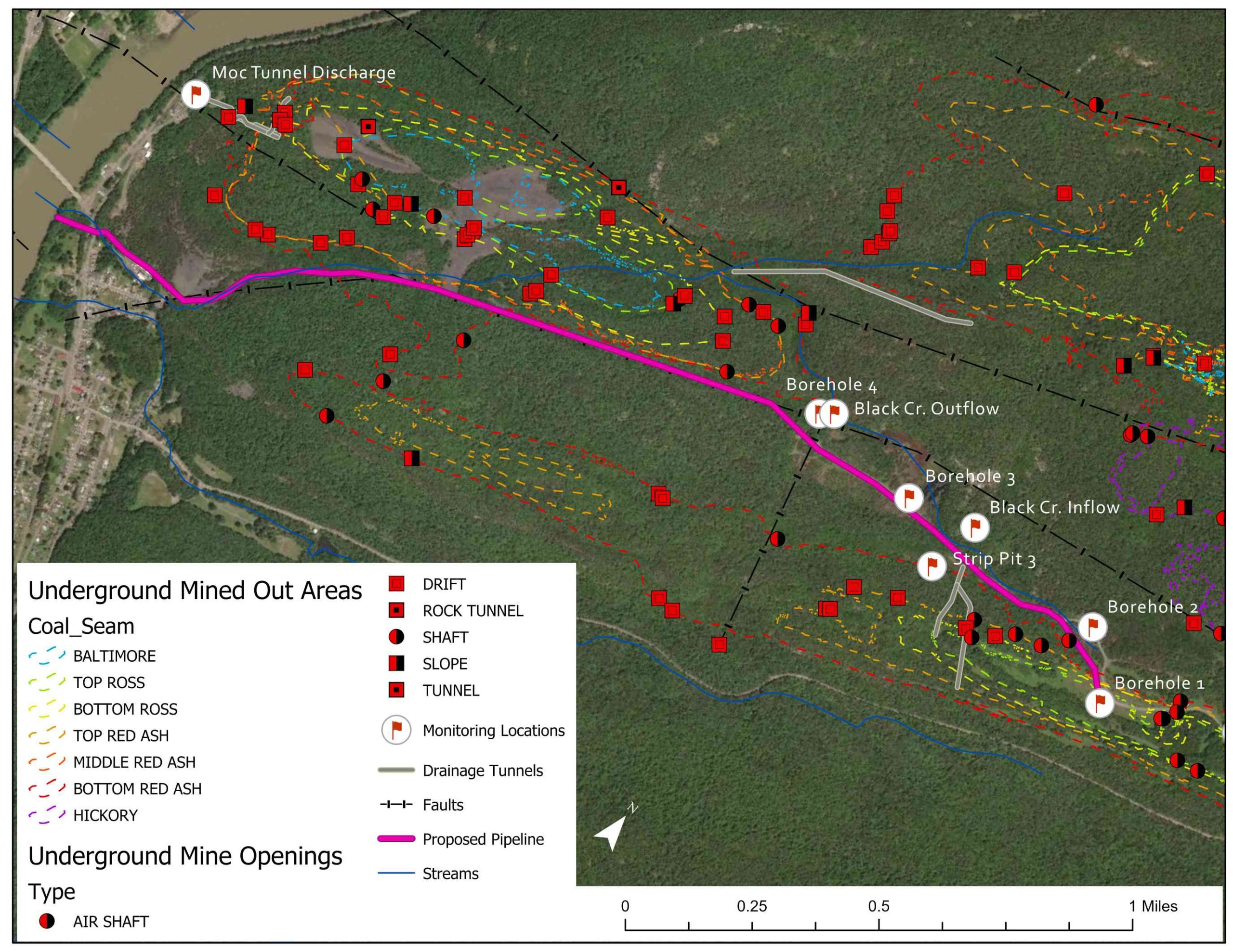 By interpreting the water level data, different levels of the mine pool below ground were found. Water level data were mapped to show how water moves across the site, down into the underground mines, and out of the tunnel.