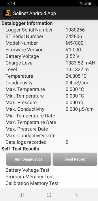 To view diagnostic information from a connected datalogger, select Diagnostics from the Navigation Menu or from the options on the Dataloggers Screen. The Diagnostics Utility can be used to run self-tests, recover a previous data log (Edge Series only), create and email reports, regenerate data files, and reset a vented datalogger.
