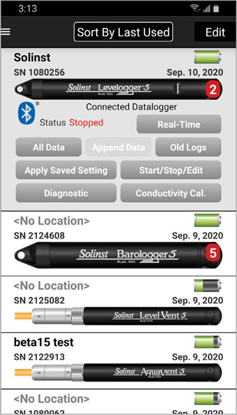 The Dataloggers Screen will also show dataloggers that were previously connected. You can select to sort this list of dataloggers by log start date, last used, file name, or location. The datalogger that is currently connected will always be shown first, and will have the Bluetooth symbol and "Connected Datalogger" below the image, to indicate that it is connected. A red number on a datalogger image indicates that there is that number of saved data files available to view from that datalogger. See Section 9.0 for viewing data files.