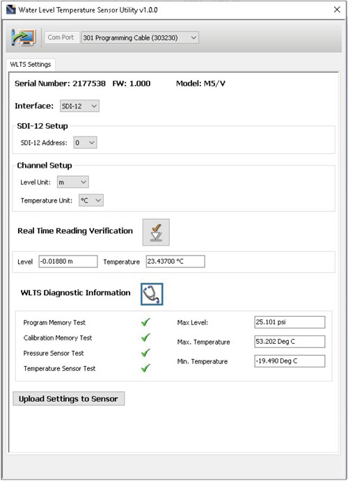 . This will retrieve and display the current programmed settings for the connected WLTS, as well as the serial number, firmware version, and model.