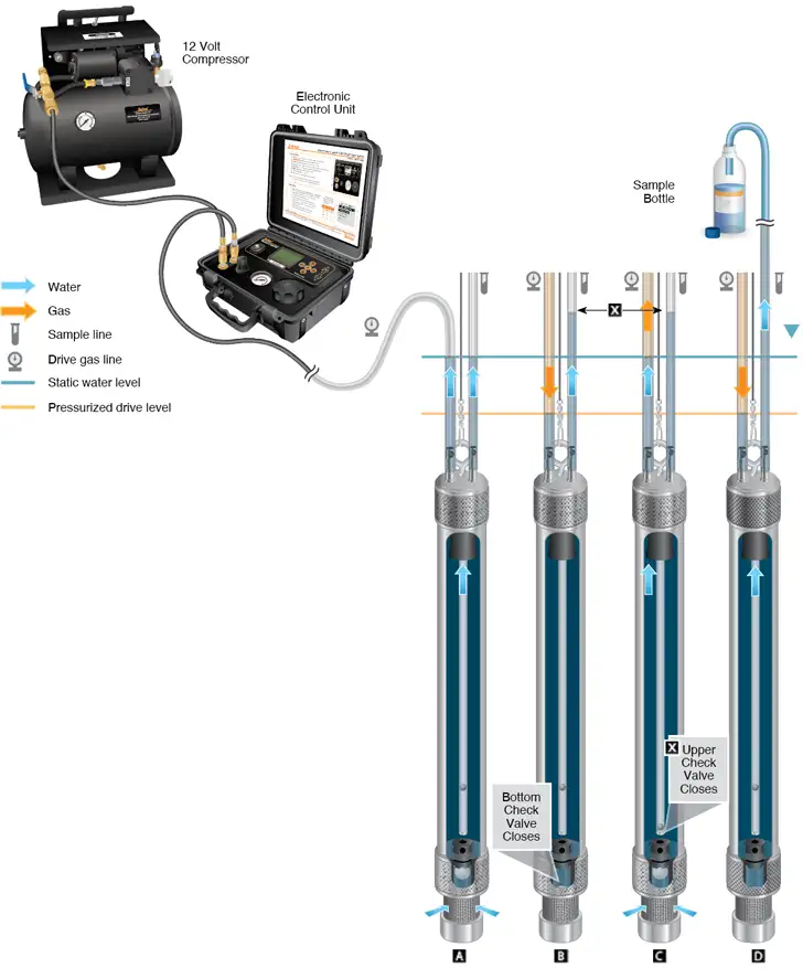 For the collection of volatiles, the pressure applied must never be too high, nor too long in duration, to enable gas to enter the body of the Pump and aerate the sample. Always calculate pressure based on static level + 10 psi, increasing the pressure and/or the drive time only incrementally to improve performance.