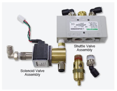 - Use the appropriate wrenches to remove the two fittings (shown above) from the Shuttle Valve Assembly. Twist to remove the Solenoid Valve Assembly from the Shuttle Valve Assembly.