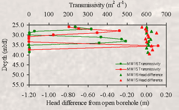 The vertical hydraulic head gradient in the upper 20-25 metres of the saturated Chalk aquifer at the site is insignificant. Below this depth the head profile observed in the upgradient well (MW14), is negative relative to the open borehole, indicating outflow in the open borehole. This observation correlates with the inferred location of a hardground at a depth of ca. 45 metres below forecourt level (mbfl) in MW14